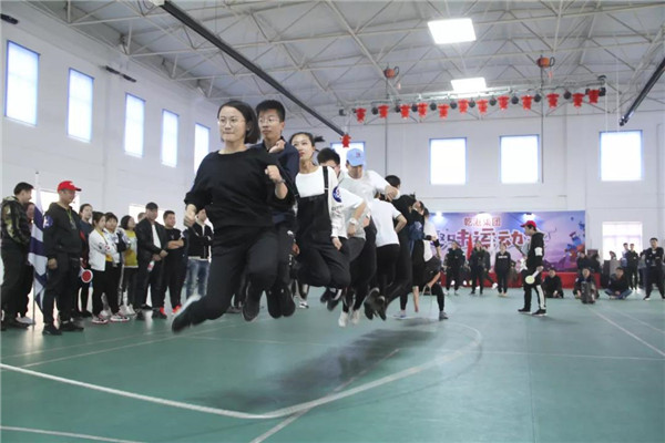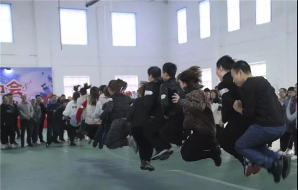 此次“袋鼠跳”全程往返為20米,以麻袋為道具。比賽規(guī)則是,隊員們排好隊,站在起跑線上,聽到發(fā)令后,進入麻袋,并向前跳躍,然后到了折返點后再跳回來,第二人接力,以此類推,直至4人全部完成,用時最短隊伍名次列前。